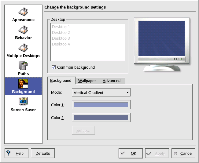 The Appearance, Behavior, and Paths, and Background icons are where you can make various desktop configuration changes. For example, to customize each virtual desktop to have different backgrounds, click the Background icon, uncheck the Common Background checkbox, click the virtual desktop you want to change, and choose the color or image you want to make your background using the associated tabs.
