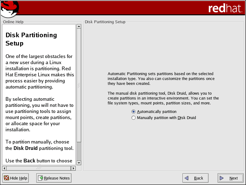 On this screen, you can choose to perform automatic partitioning, or manual partitioning using Disk Druid.